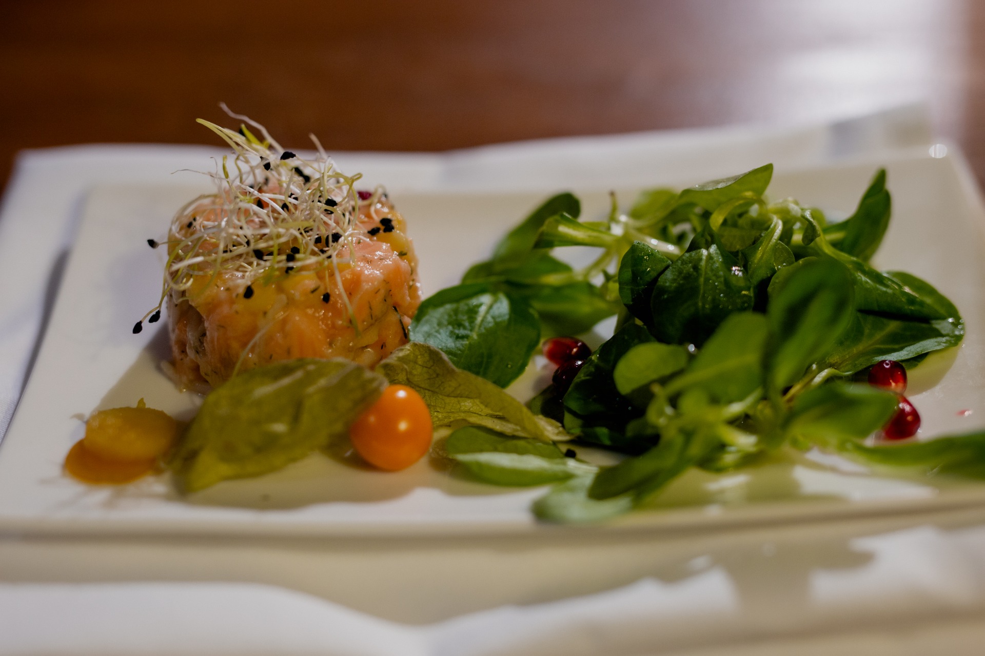 *Explosion de saveurs : Ceviche de saumon frais, mangue, grenade et pousses de soja, mâche et vinaigrette aux agrumes